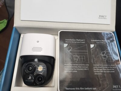 箱開けてみたらコンパクトなカメラと太陽光パネル。これで録画できるなんて素晴らしいですね。